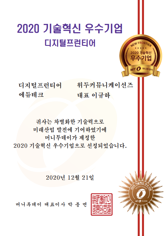 2020 기술혁신 우수기업 페이지 정보 작성자 WeDu 댓글 0건 조회 6,099회 작성일 21-12-31 12:58 본문 2020-12-21 2020 기술혁신 우수기업 디지털프런티어 에듀테크 머니투데이 대표이사 List Previous2020 소년한국 우수 어린이 도서 선정 21.12.31 Next2020 서울산업진흥원 2020 DMC어워드 21.12.31