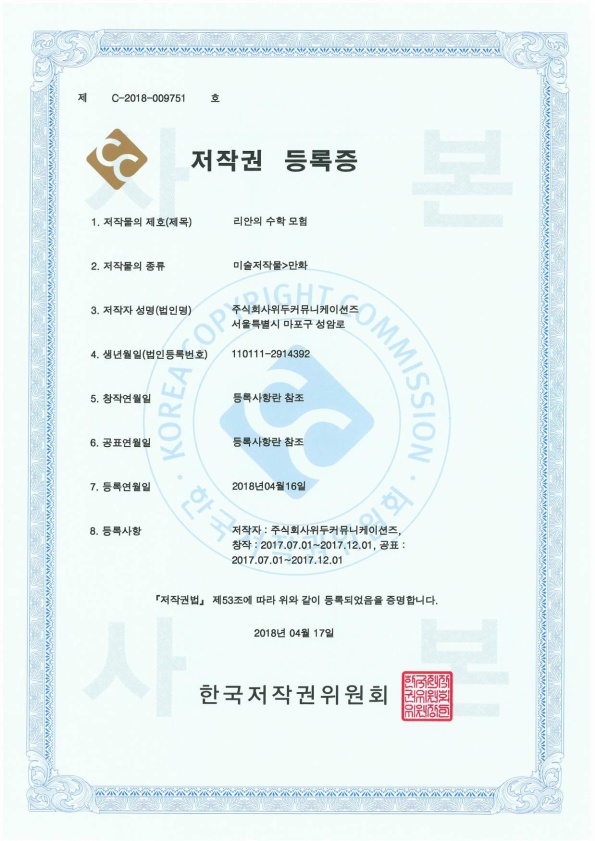 [한국/저작권] 리안의 수학 모험 페이지 정보 작성자 WeDu 댓글 0건 조회 5,975회 작성일 19-05-30 19:07 본문 2018-04-16 저작권 C-2018-009751 리안의 수학 모험 / 미술저작물>만화 List Previous[한국/저작권] 길리 19.05.30 Next[한국/저작권] 신입사원조기전력화 이러닝 콘텐츠 19.05.30